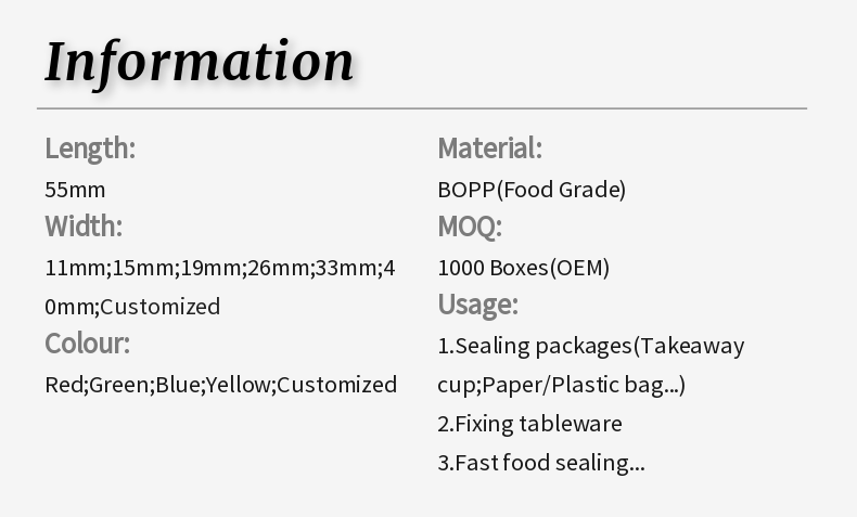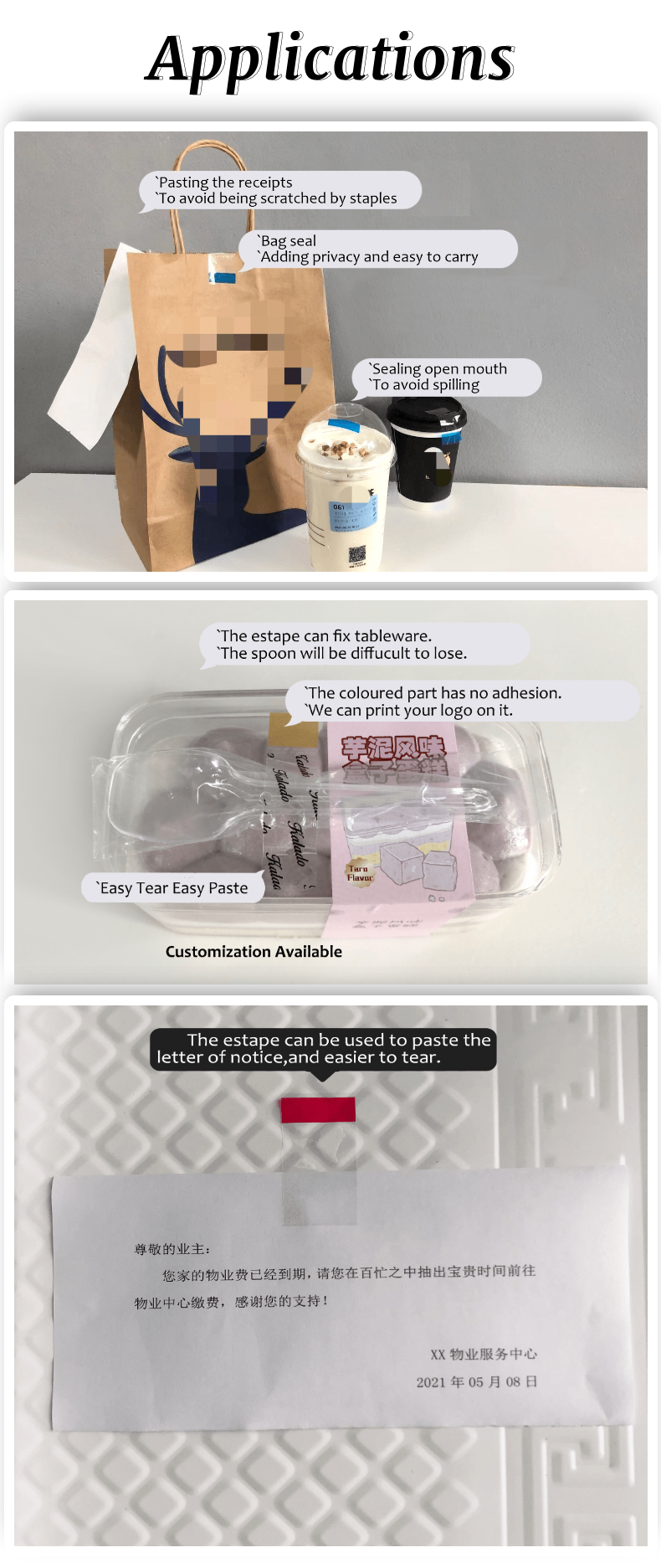Une sorte de ruban adhésif simple face en flocons à déchirer et à coller, fabriqué en matériau OPP/PE. Chaque morceau de ruban comporte deux parties : une partie adhésive et une partie sans colle. Il est très polyvalent. Vous pouvez facilement sceller des emballages alimentaires comme le lait - des tasses à thé, des tasses à café ou des sacs à pain, et des pages de marquage ou des notes autocollantes… Pour sceller les emballages alimentaires, cela empêche les plats à emporter de fuir et améliore la conservation des aliments. En collant l'estape sur les livres, vous trouverez la page facilement. De plus, vous peut également écrire des mémos dessus. Nous fournissons également la base de la bande, afin que vous puissiez déchirer l'estape plus facilement.